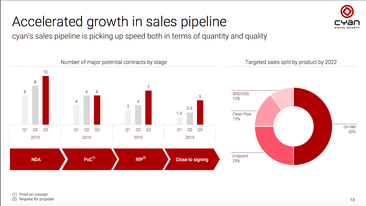 The Orange contract is the biggie. Across the entire system Cyan will be in 28 countries, exposed to 260mm fixed and residential customers, across residential and business accounts. Implementation has been ongoing throughout 2019 with rollout in France in Q4 2019 with the rest of Europe and Africa to follow in Q1 2020.